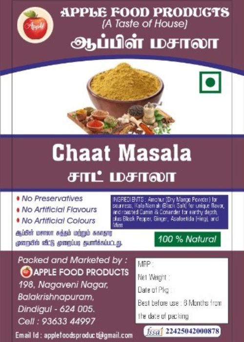 Experience the rich aroma and authentic flavor of Apple Food Products சாட் மசாலா, made from carefully selected high-quality ingredients and processed under hygienic conditions to maintain purity and freshness.